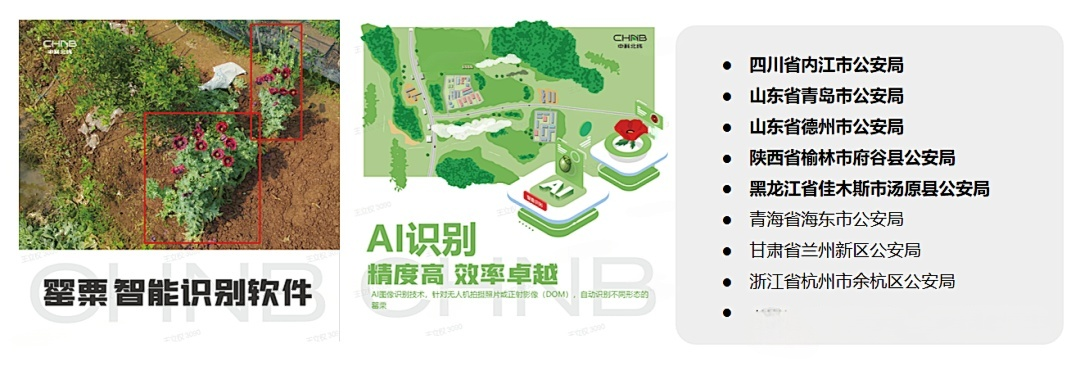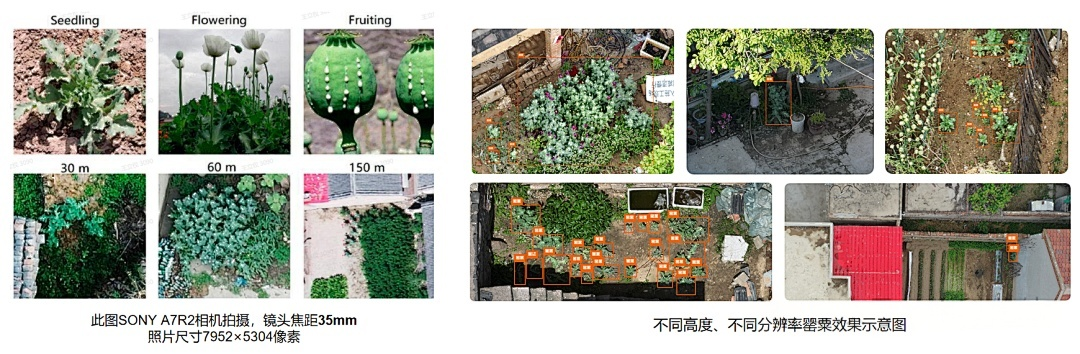 通过AI图像识别技术,可针对无人机拍摄的照片或正射影像(DOM),自动识别出苗期、花期、果期等不同形态的罂粟,精确识别罂粟植株,同时提取罂粟植株所在地理坐标,大大减轻了人工目视工作量,节省劳动力,提高作业效率和识别精度,使得进行大区域的罂粟巡查工作更便捷。