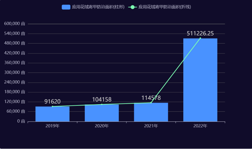 近年来,在天牛防治方面,花绒寄甲防治技术在全国范围内得到了大量应用和快速发展。以防治松墨天牛为例,各年度在防治过程中应用花绒寄甲防治技术数据展示(数据来源于全国林业有害生物防治信息系统)