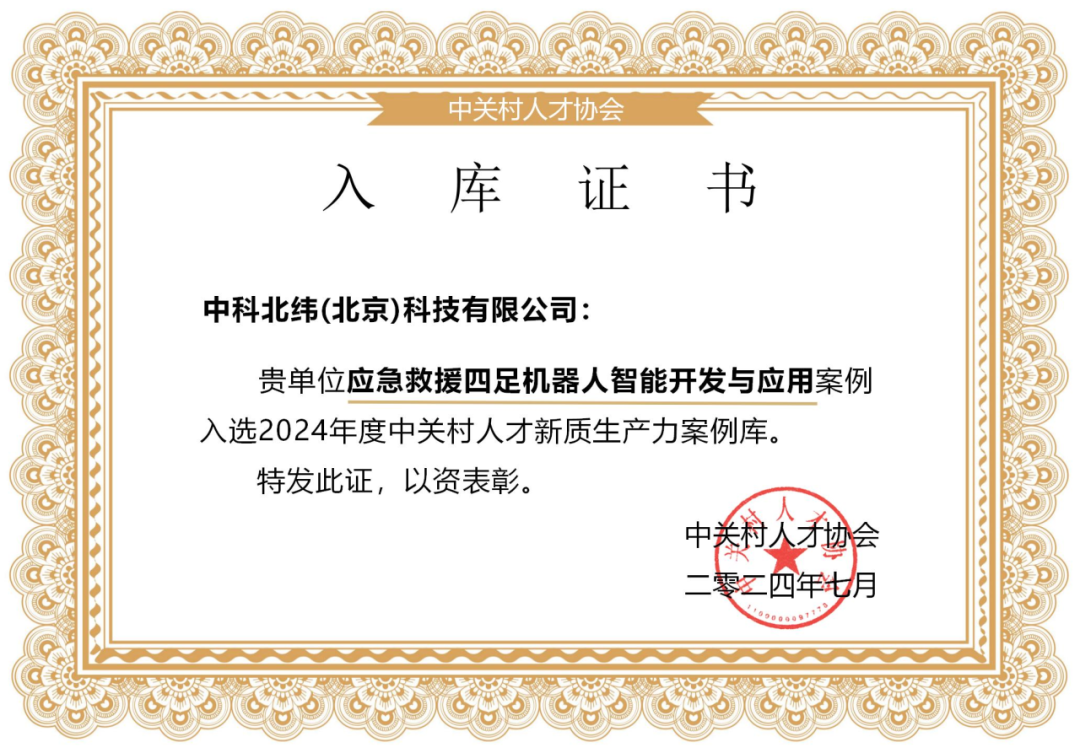 日前,中关村人才协会启动新质生产力实践案例征集活动,汇聚了国家发改委、中关村人才协会等专家及业内领袖,旨在挖掘和展示我国新质生产力的创新实践与成果,为高质量发展提供有力支撑。经过一系列严格的评审流程,中科北纬(北京)科技有限公司“应急救援四足机器人智能开发与应用案例”,成功入选“2024年度中关村人才新质生产力案例库”并荣获入库证书。