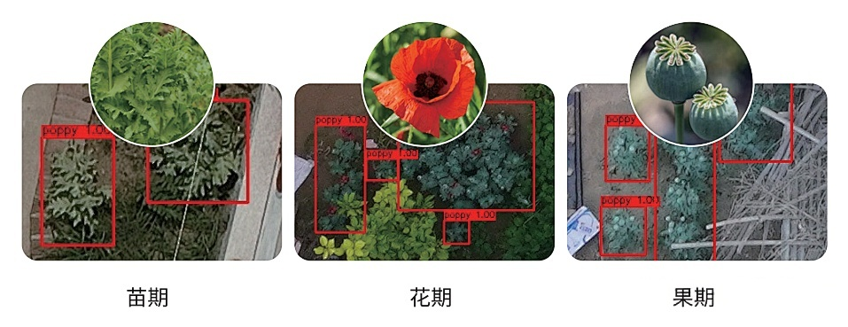 通过AI图像识别技术,可针对无人机拍摄的照片或正射影像(DOM),自动识别出苗期、花期、果期等不同形态的罂粟,精确识别罂粟植株,同时提取罂粟植株所在地理坐标,大大减轻了人工目视工作量,节省劳动力,提高作业效率和识别精度,使得进行大区域的罂粟巡查工作更便捷。