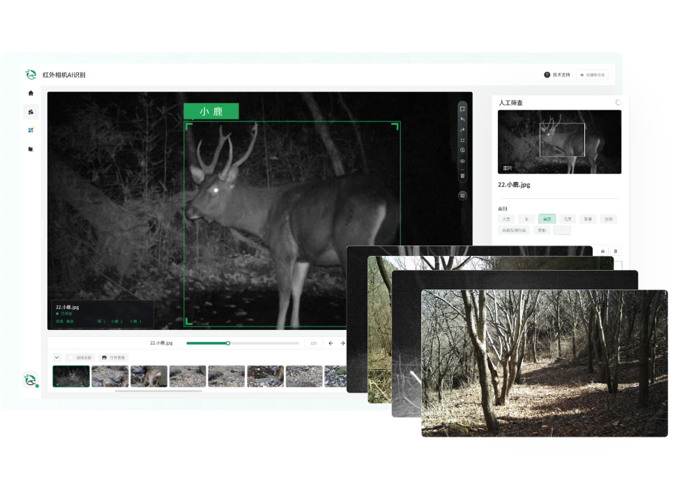 通过AI智能识别快速进行物种分类,支持人工筛查,对识别结果精细审核